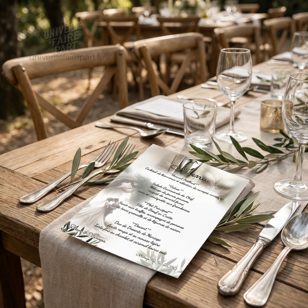 Personnalisation : Adaptez le menu avec les noms des mariés, la date du mariage, et votre choix de plats, pour une intégration parfaite dans l’ambiance et le décor de votre réception.
