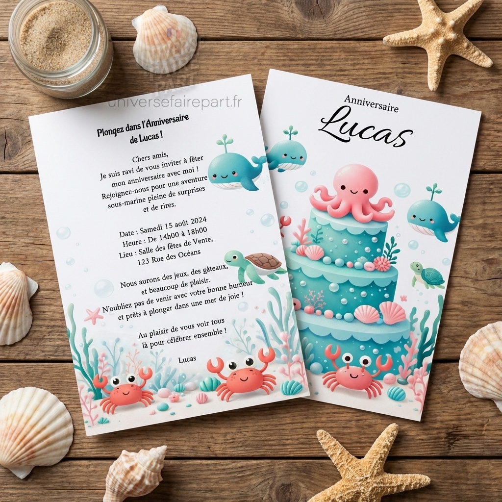 Je suis ravi de vous inviter à fêter mon anniversaire avec moi ! Rejoignez-nous pour une aventure sous-marine pleine de surprises et de rires.