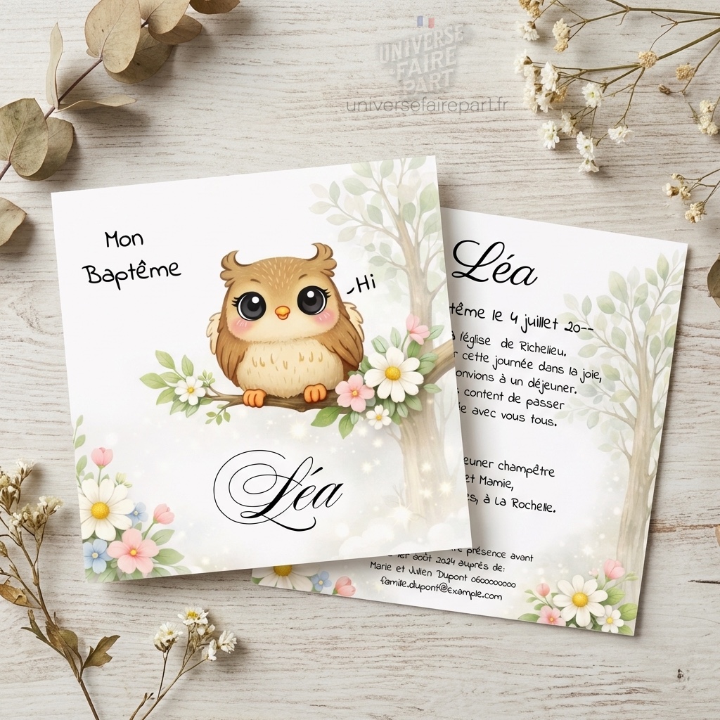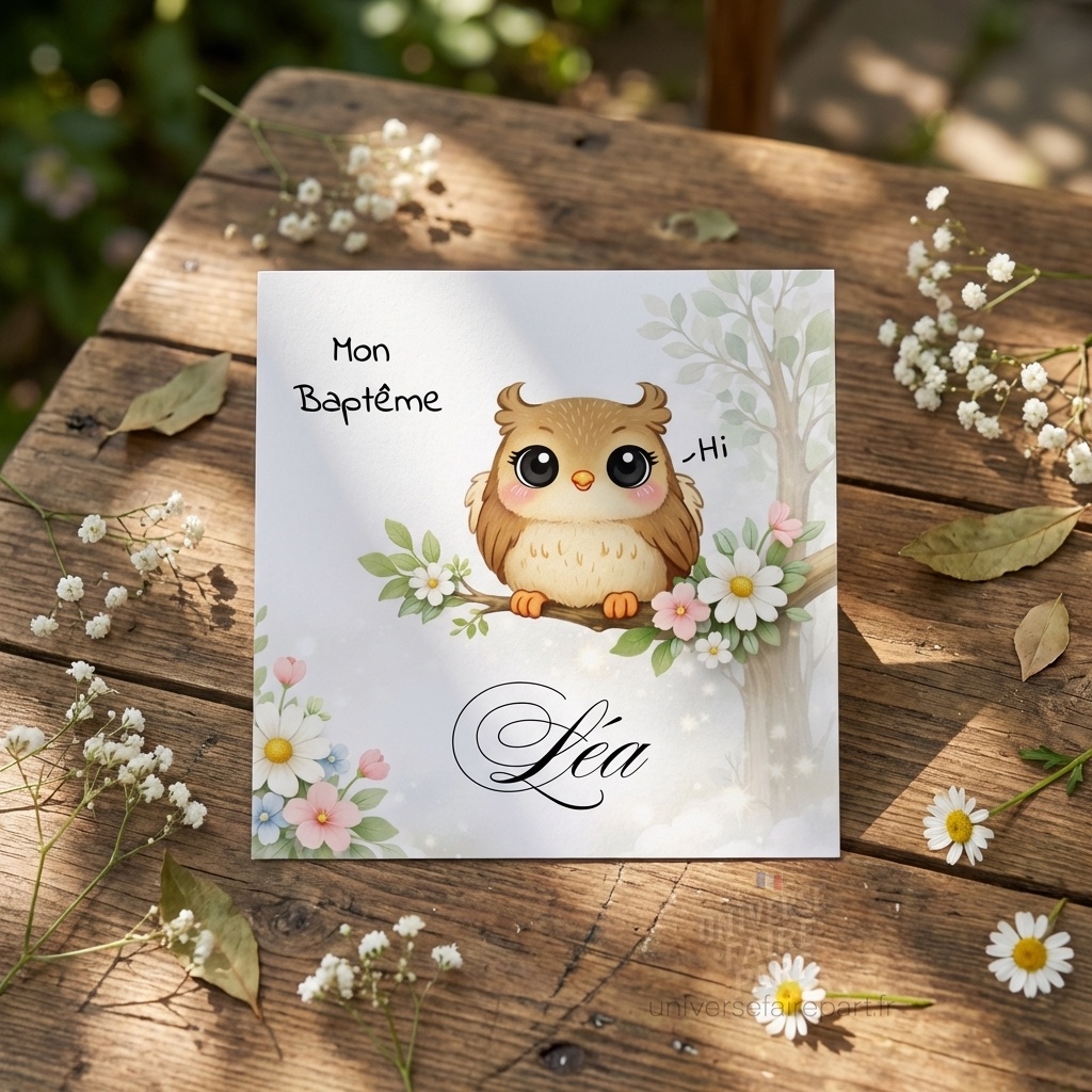 Notre faire-part Original – Hibou pour Enfant Adorable – Carte Recto est conçu pour évoquer la beauté et la tendresse de votre événement. Le design avec le hibou apporte une touche de charme et d’adorabilité à votre annonce.