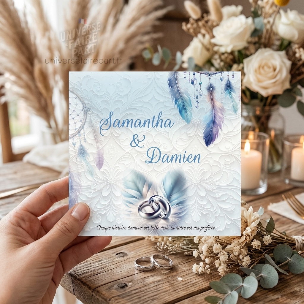Invitez vos convives à partager le bonheur de votre union autour d’un repas festif avec notre Carton Repas Mariage, conçu pour compléter avec finesse votre faire-part. Cette élégante invitation dépeint une harmonie visuelle de motifs délicats et d’ornements inspirés, évoquant la douceur et la joie de l’occasion.