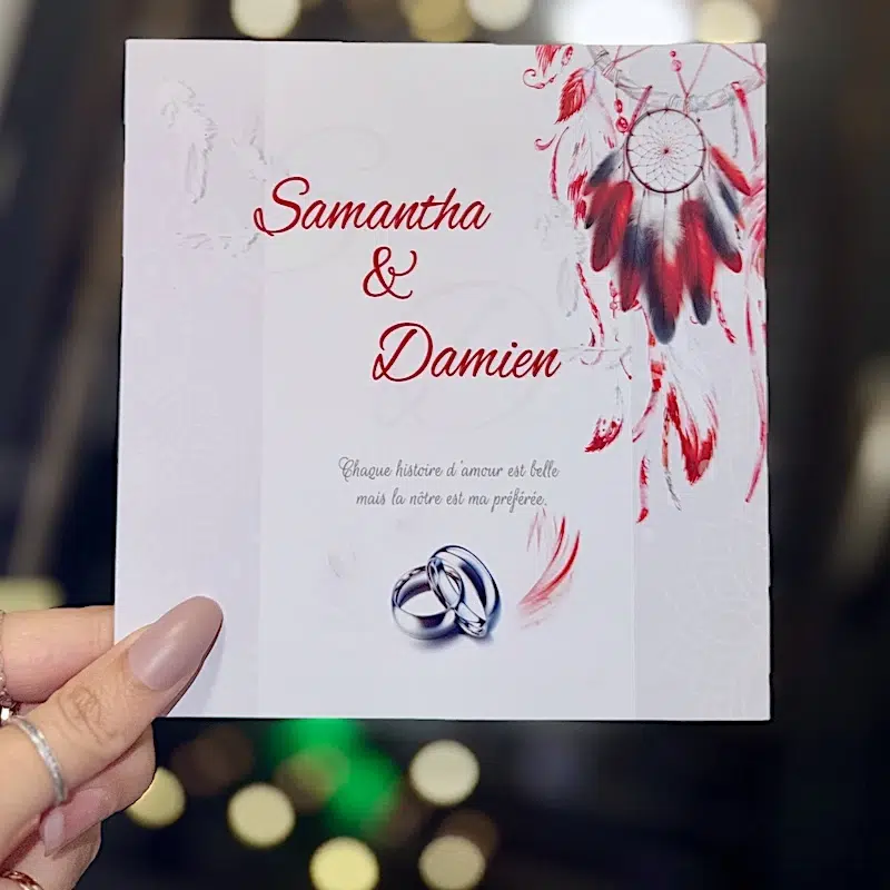 Rehaussé de motifs délicats, il présente des plumes stylisées dans un camaïeu de rouge et de gris, reprenant l’esthétique de l’attrape-rêve de votre invitation principale. Ce design raffiné est ponctué par la silhouette espiègle d’angelots, évoquant l’affection et la joie qui entourent votre union.