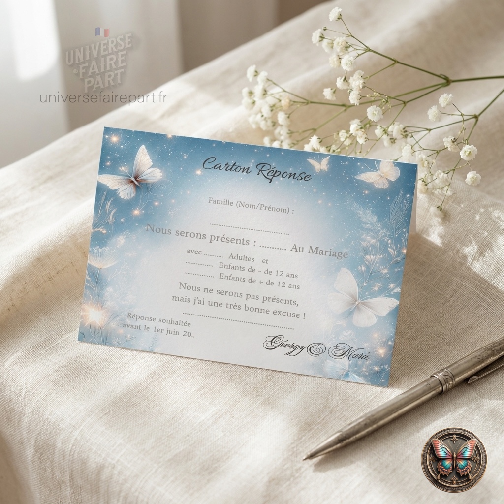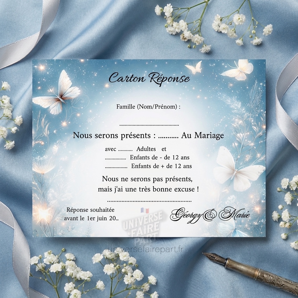 Sur un fond d’un bleu romantique, chaque papillon incarne l’anticipation et la joie de partager un moment si spécial. Les invités seront enchantés de remplir et de retourner ce carton, dont chaque détail a été soigneusement pensé pour faciliter une réponse aisée et élégante.