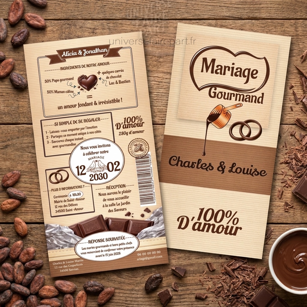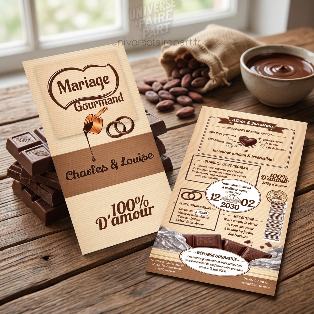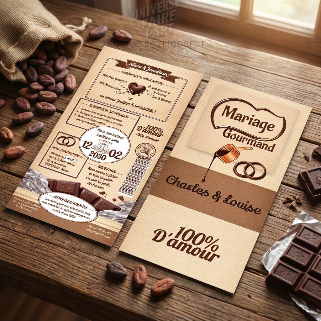 Laissez les arômes envoûtants du chocolat et le cœur rouge passionné vous guider vers des souvenirs mémorables. Partagez votre amour, votre bonheur et votre appétit pour les plaisirs sucrés avec vos proches grâce à ce faire-part original et appétissant.