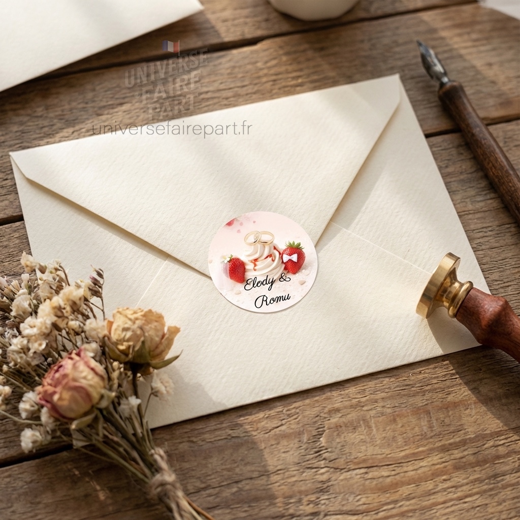 Mots-clés : rond autocollant mariage, sticker mariage personnalisé, étiquette mariage, autocollant faire-part mariage, papeterie mariage élégante, mariage gourmand, pomme d’amour mariage