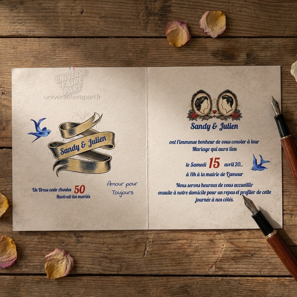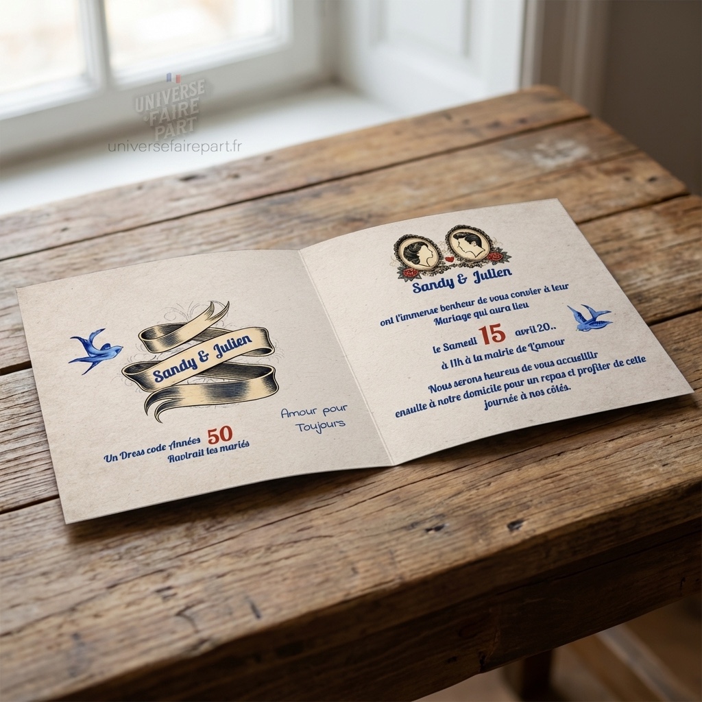 - Design Rockabilly: Inspiré des années 50, ce faire-part met en avant un design rockabilly avec des éléments graphiques qui captivent et séduisent.