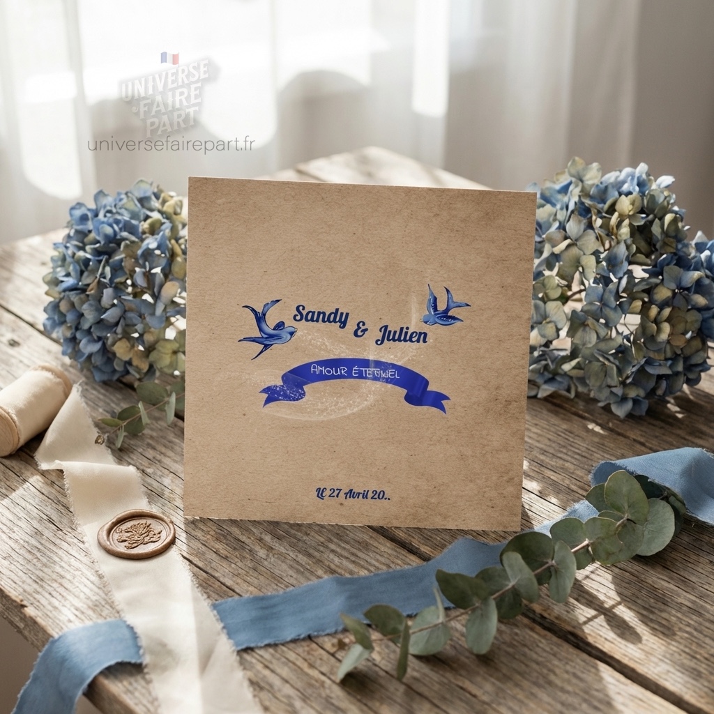 Faites de votre événement un moment inoubliable avec le faire-part « N°270 – Faire-part Rockabilly oiseaux bleu roi kraft », alliant élégance rétro et charme naturel
