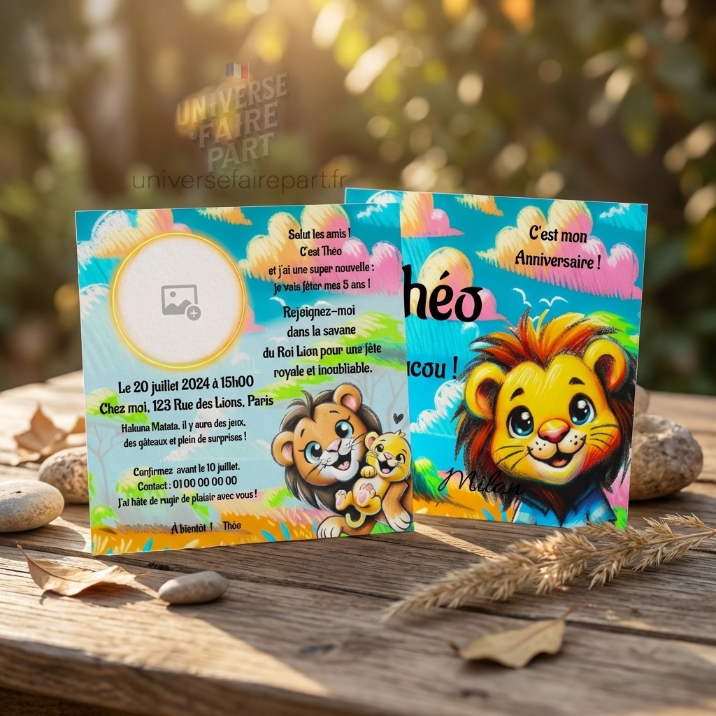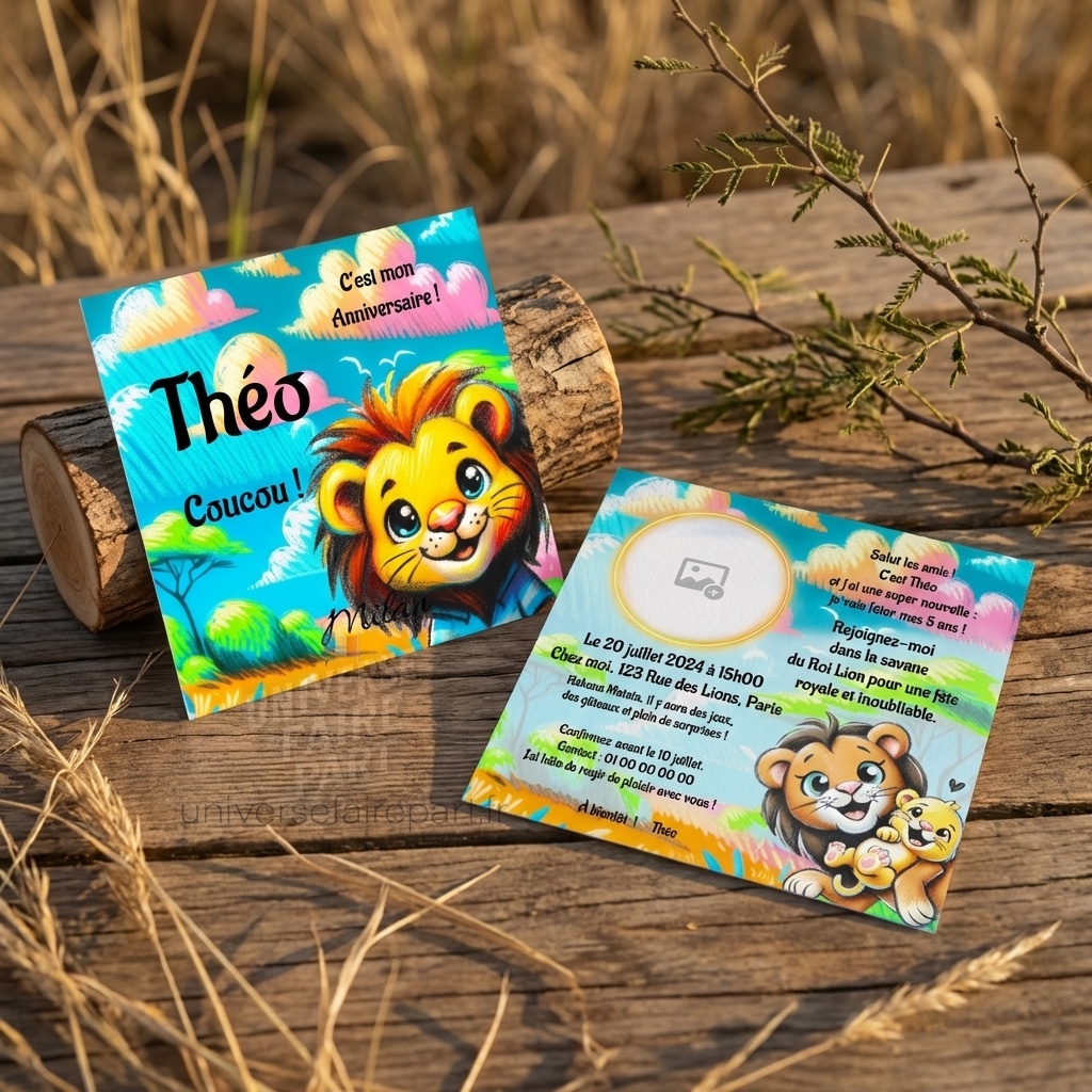 Ajoutez une touche de majesté à l’annonce de la naissance de votre enfant avec notre faire-part « Roi Lion Petite Majesté de la Savane ». Commandez dès maintenant et offrez à vos proches un souvenir précieux et intemporel.