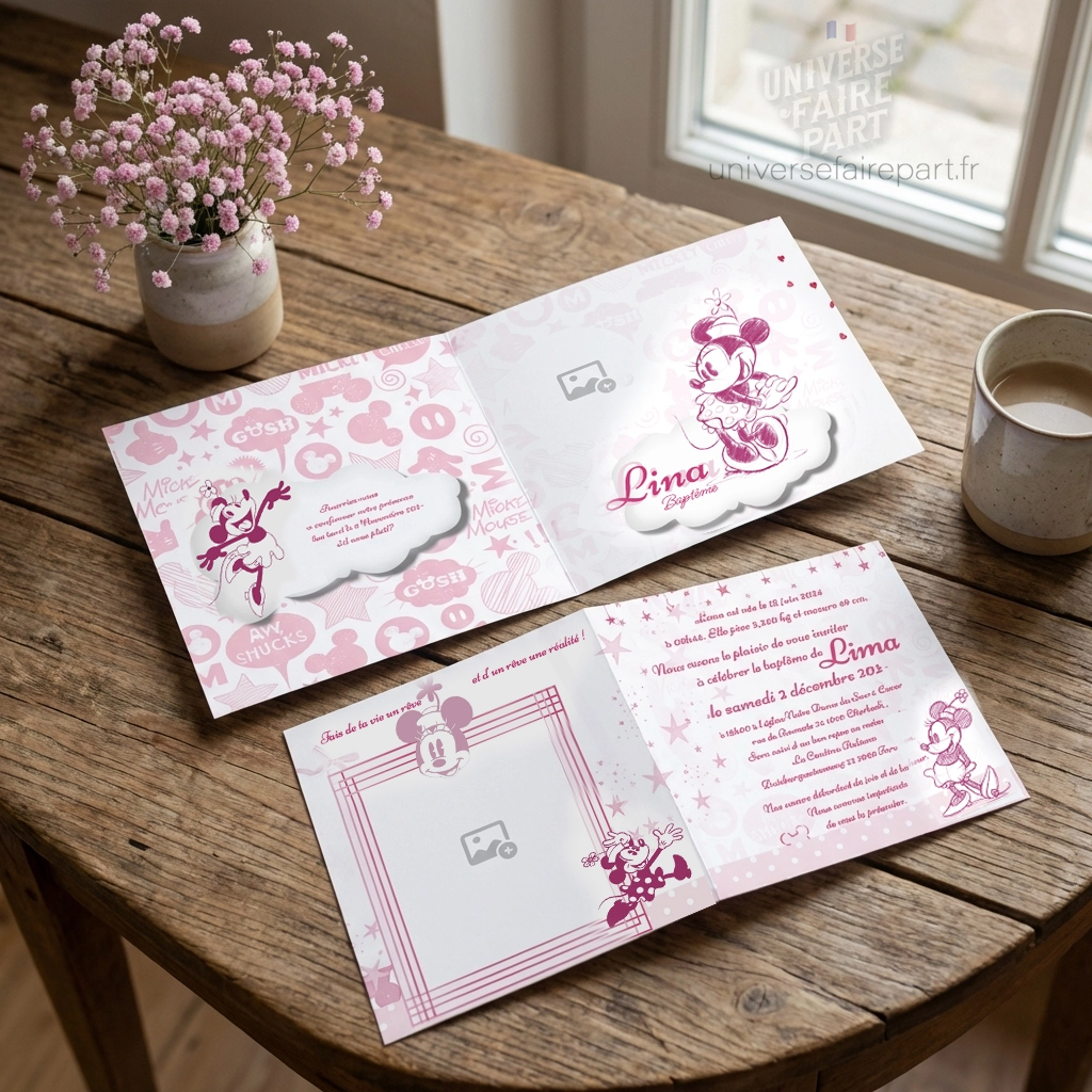N°382 – Faire-part petite Minnie baptême ou naissance douce tendresse