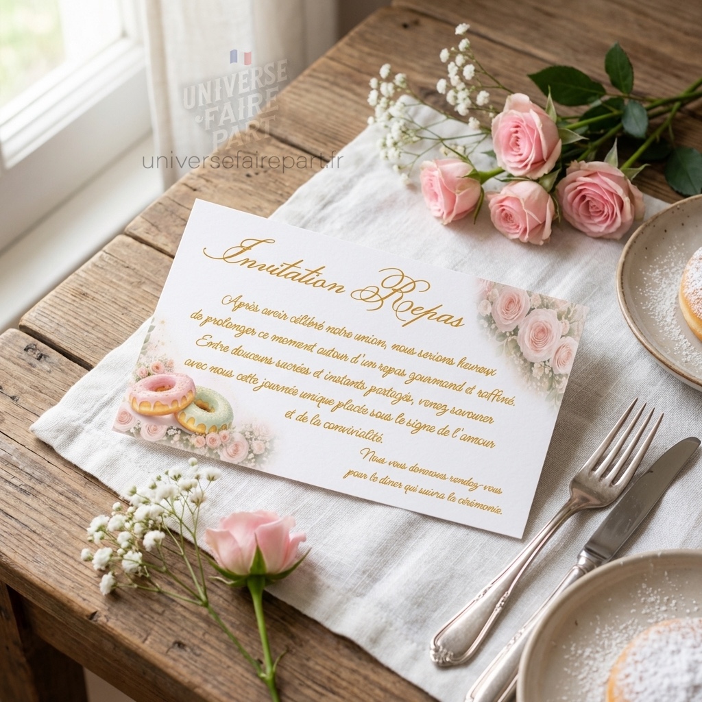 Carton repas élégant assorti au faire-part, dans un univers gourmand et raffiné aux tons rose poudré. Ce modèle met en valeur votre invitation au repas avec une mise en page claire et harmonieuse, idéale pour prolonger votre mariage dans une ambiance douce et conviviale.