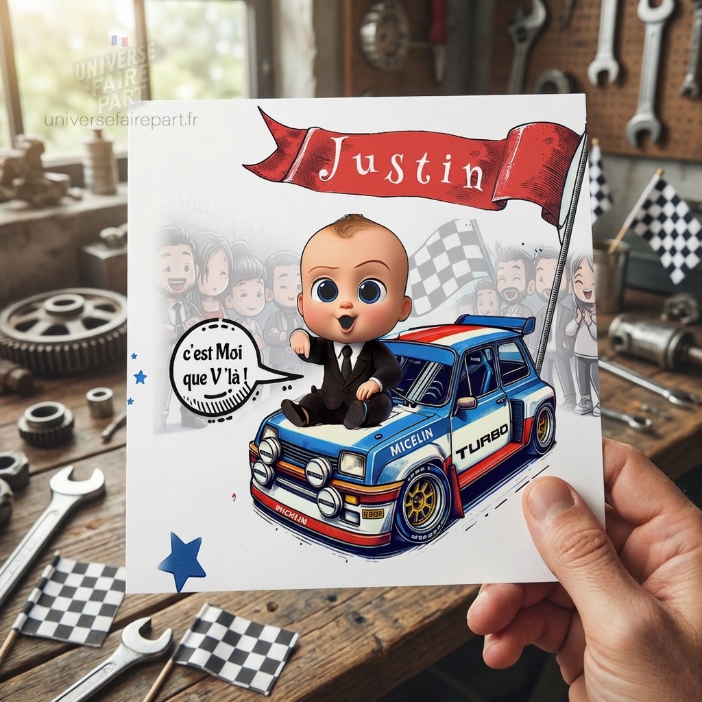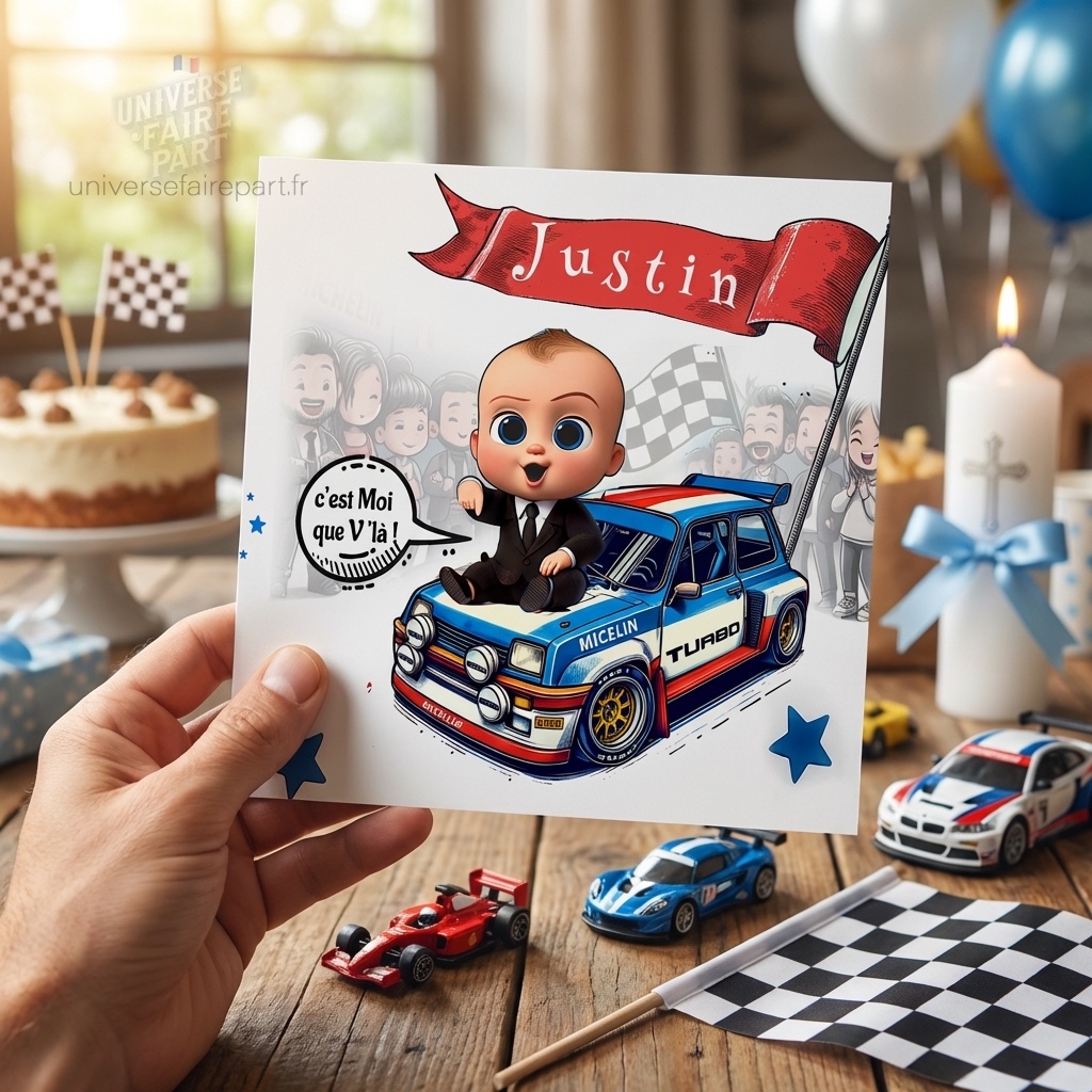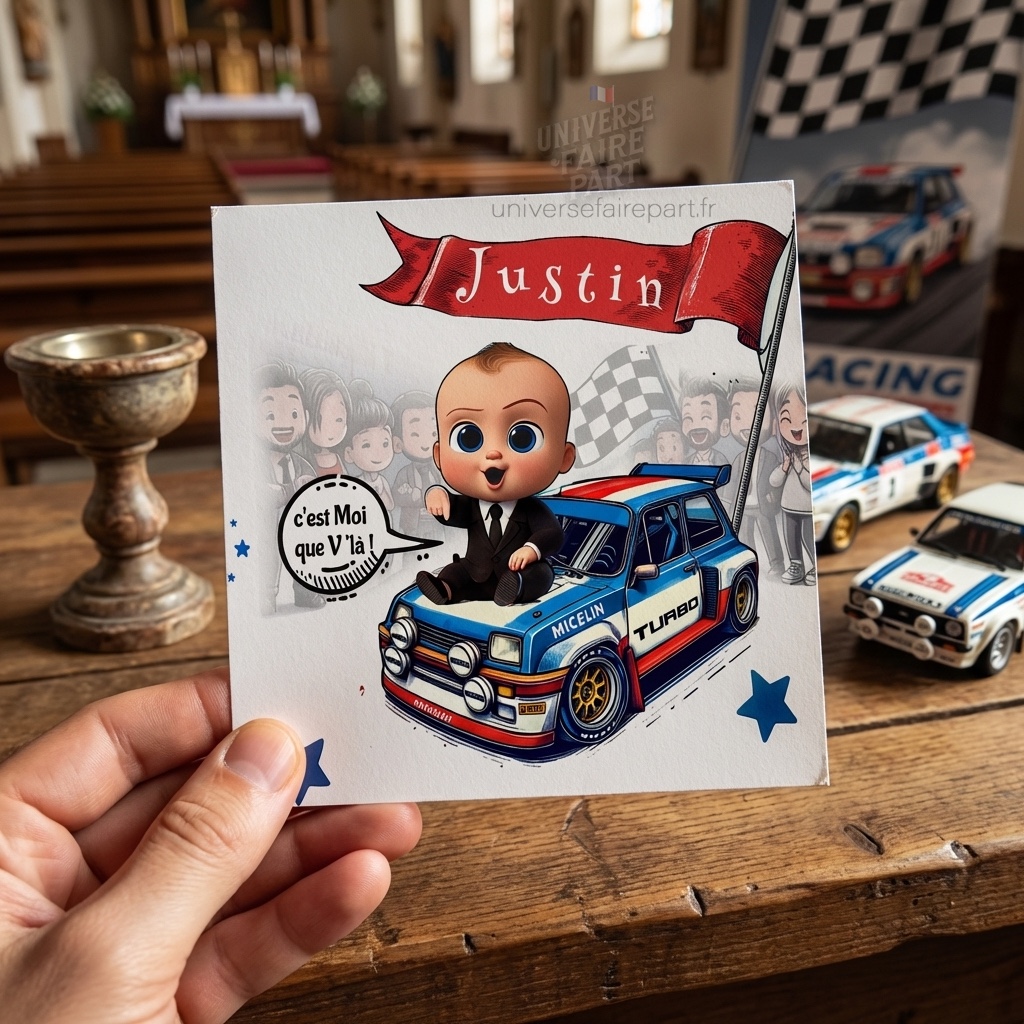 Préparez-vous à faire de l’arrivée de votre petit trésor un événement mémorable avec notre faire-part de baptême « Boss Baby Rally ». Passez votre commande dès aujourd’hui et mettez-vous en pole position pour une célébration inoubliable !