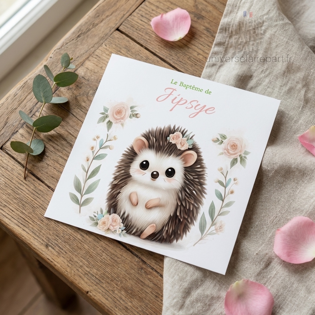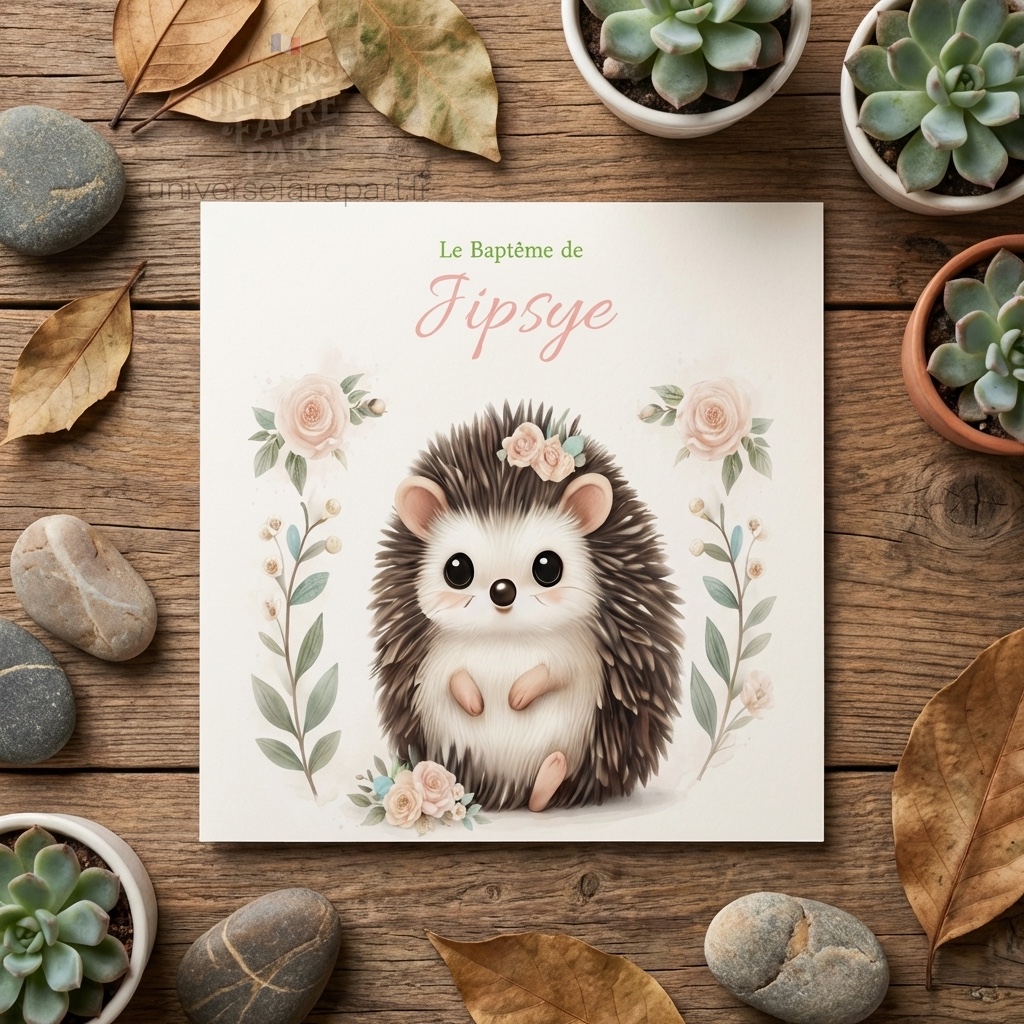- Illustration Adorable : Un adorable hérisson entouré de fleurs, représentant la douceur et l’innocence de votre enfant. Le petit hérisson est dessiné avec des détails fins et des couleurs douces, capturant un regard innocent et charmant.