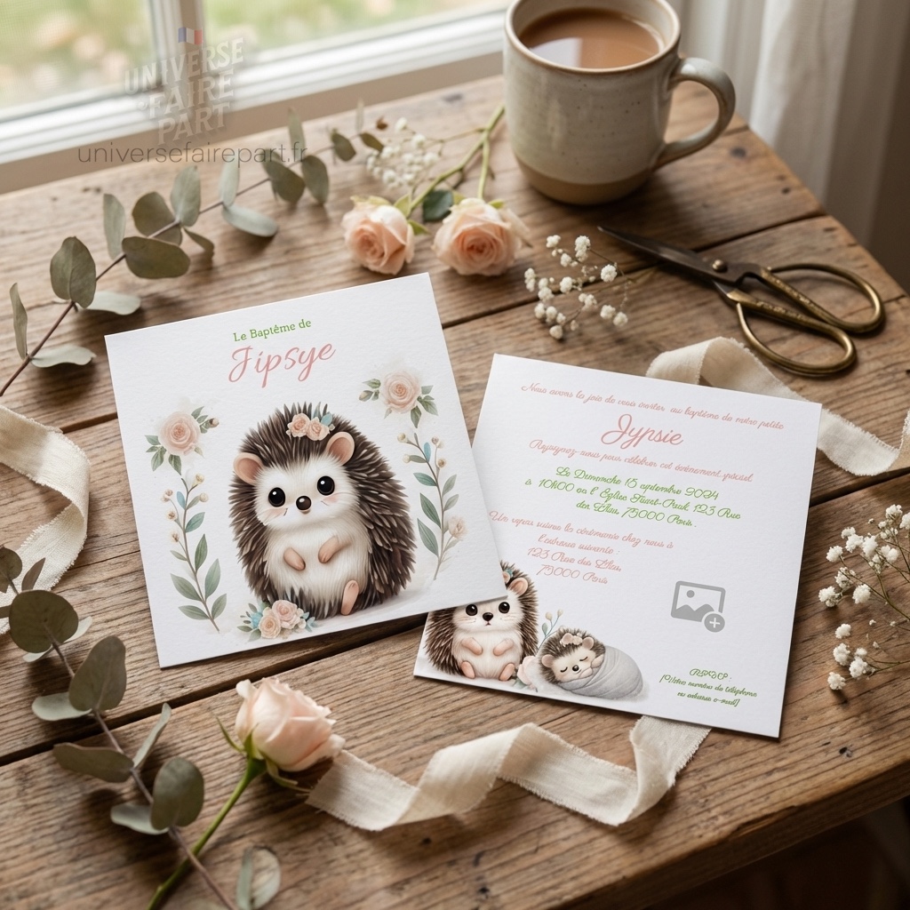 Invitez vos proches à célébrer le baptême de votre petite princesse avec notre faire-part « Petite Hérissonne d’Amour ». Ce modèle délicat et attendrissant est parfait pour annoncer ce moment spécial avec élégance et tendresse.