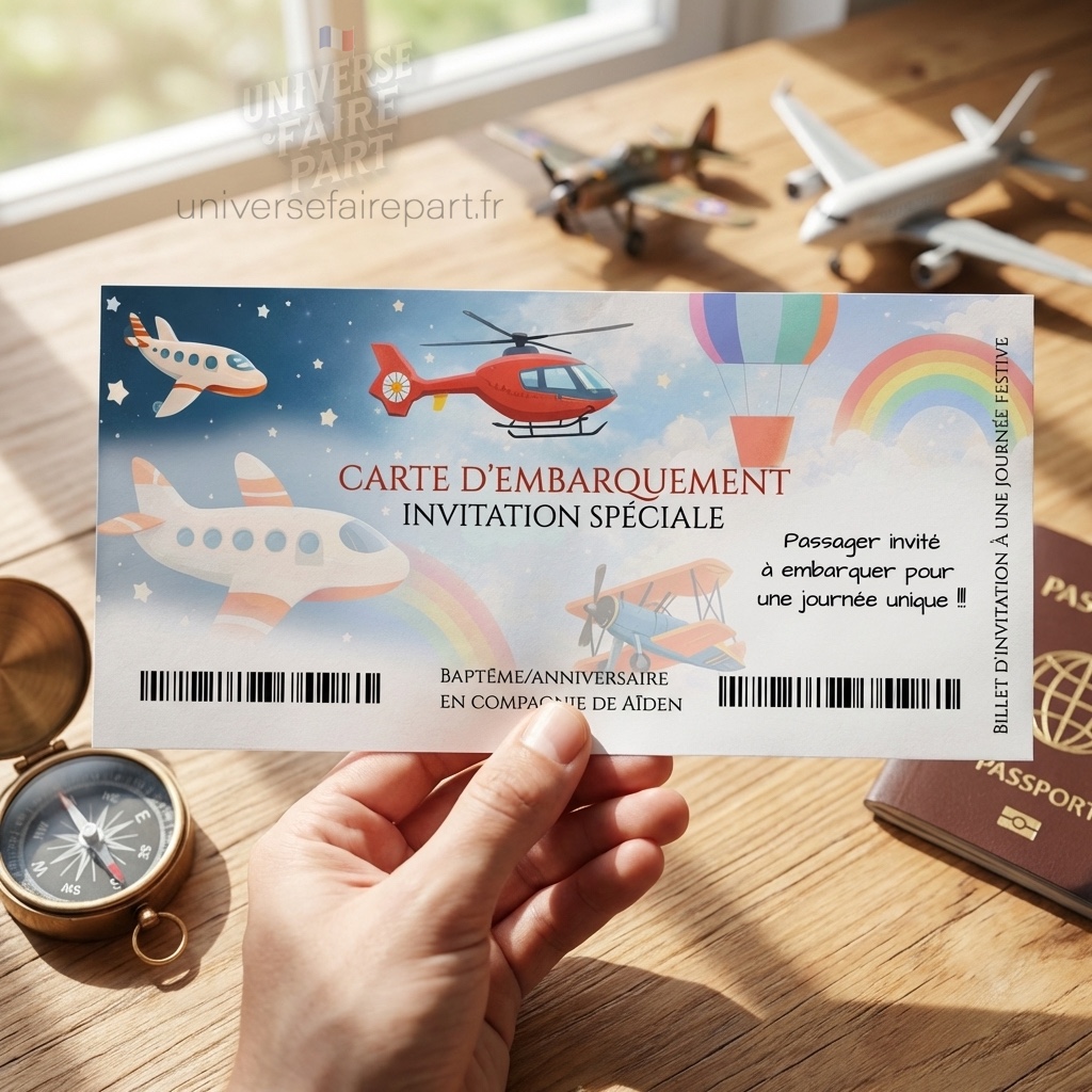 Le faire-part N°585 est une invitation originale sur le thème de l’aviation, idéale pour annoncer un anniversaire d’enfant. Son univers graphique coloré met en scène plusieurs avions illustrés, un hélicoptère, une fusée, des montgolfières et des arcs-en-ciel, créant une ambiance de voyage et d’aventure.