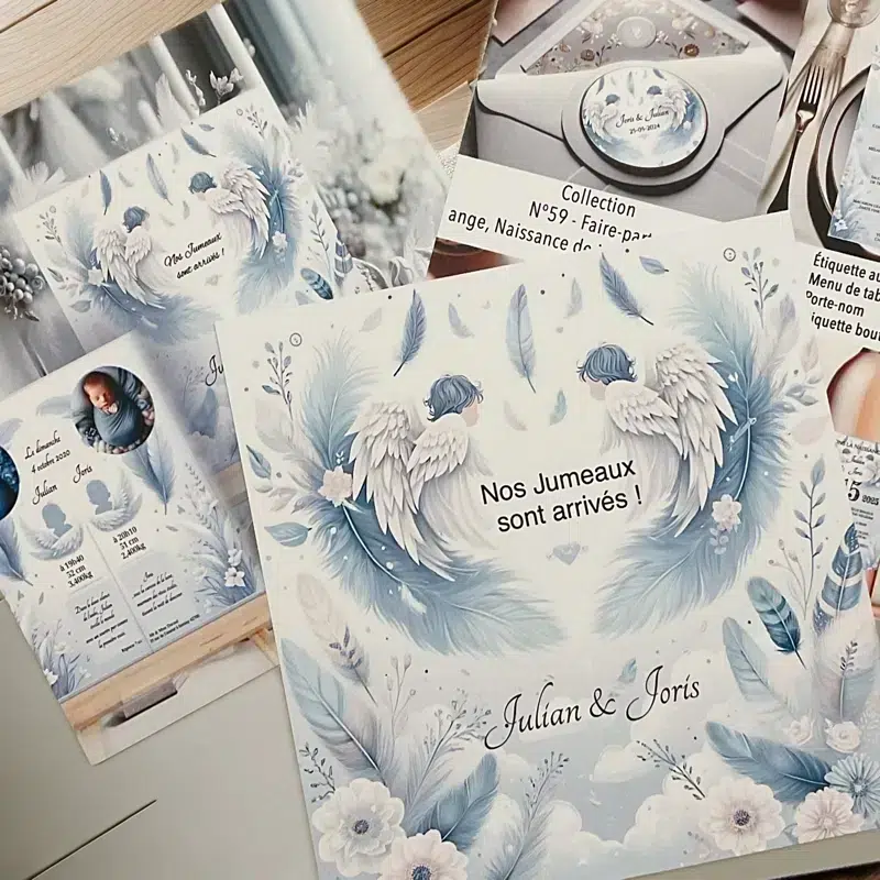 Invitez la douceur et la sérénité dans votre annonce avec notre faire-part « Julian & Joris ». Chaque détail de cette carte soigneusement conçue, du design aux couleurs, est pensé pour célébrer l’arrivée de vos jumeaux avec une élégance paisible. Le mariage de plumes délicates et de teintes de bleu pastel crée une atmosphère douce et rêveuse, idéale pour partager la nouvelle de cette double bénédiction. Visitez notre site pour en savoir plus et pour accueillir vos petits anges avec style.