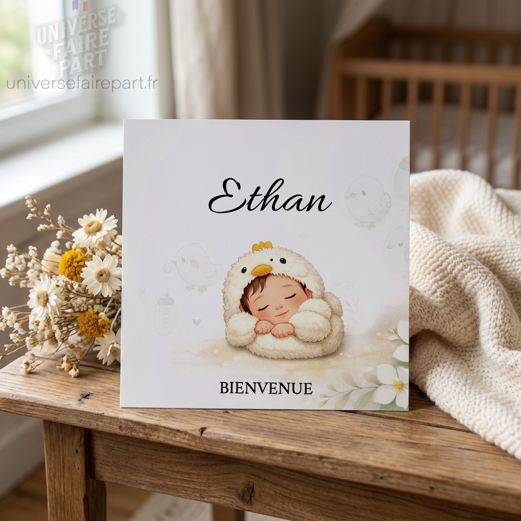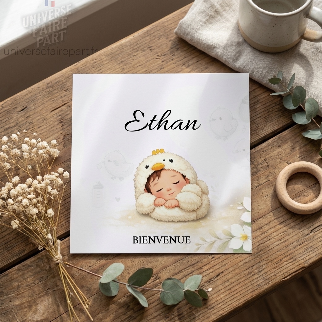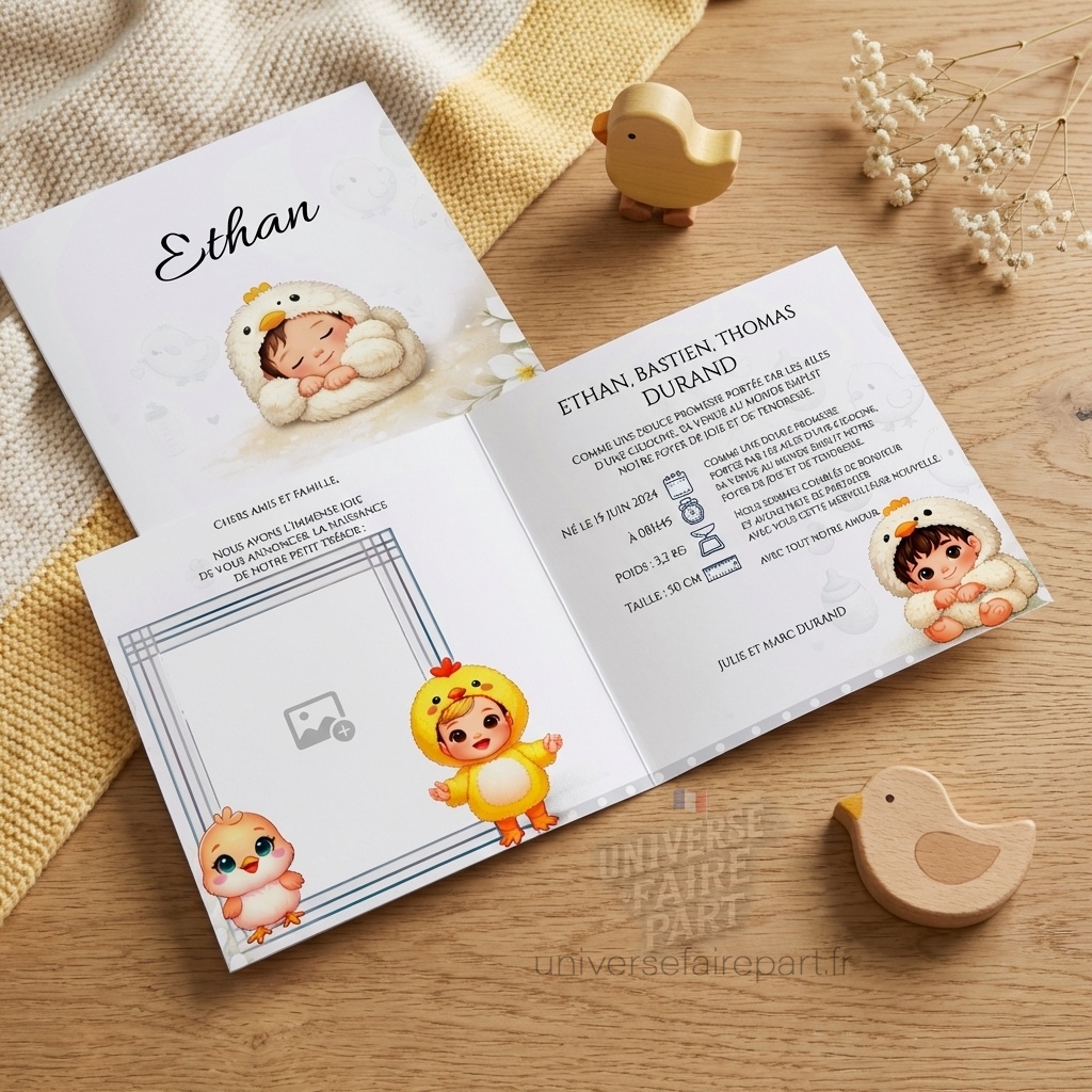 Découvrez notre Faire-Part de Naissance ‘Câlin de Poussin’, une célébration douce et attendrissante de votre nouveau-né. Inspiré par la tendresse infinie d’un poussin, ce faire-part combine des teintes apaisantes de bleu pastel avec des illustrations charmantes de poussins et d’accessoires bébé. Au centre, la photo de votre petit trésor, rayonnant et lové dans un costume de poussin, attire les regards et les cœurs. Le prénom de l’enfant, « Malo », est mis en évidence avec élégance, flottant sur un nuage blanc qui annonce ‘Notre petit Poussin’, ajoutant une touche personnelle et chaleureuse. Idéal pour partager la nouvelle de votre bonheur avec famille et amis, ce faire-part est une douce introduction à l’histoire qui commence pour votre bébé. Chaque carte est une promesse de sourires et d’émerveillement, un souvenir qui restera cher pour les années à venir. N°76 – Faire-part Naissance Baptême Câlin de Poussin