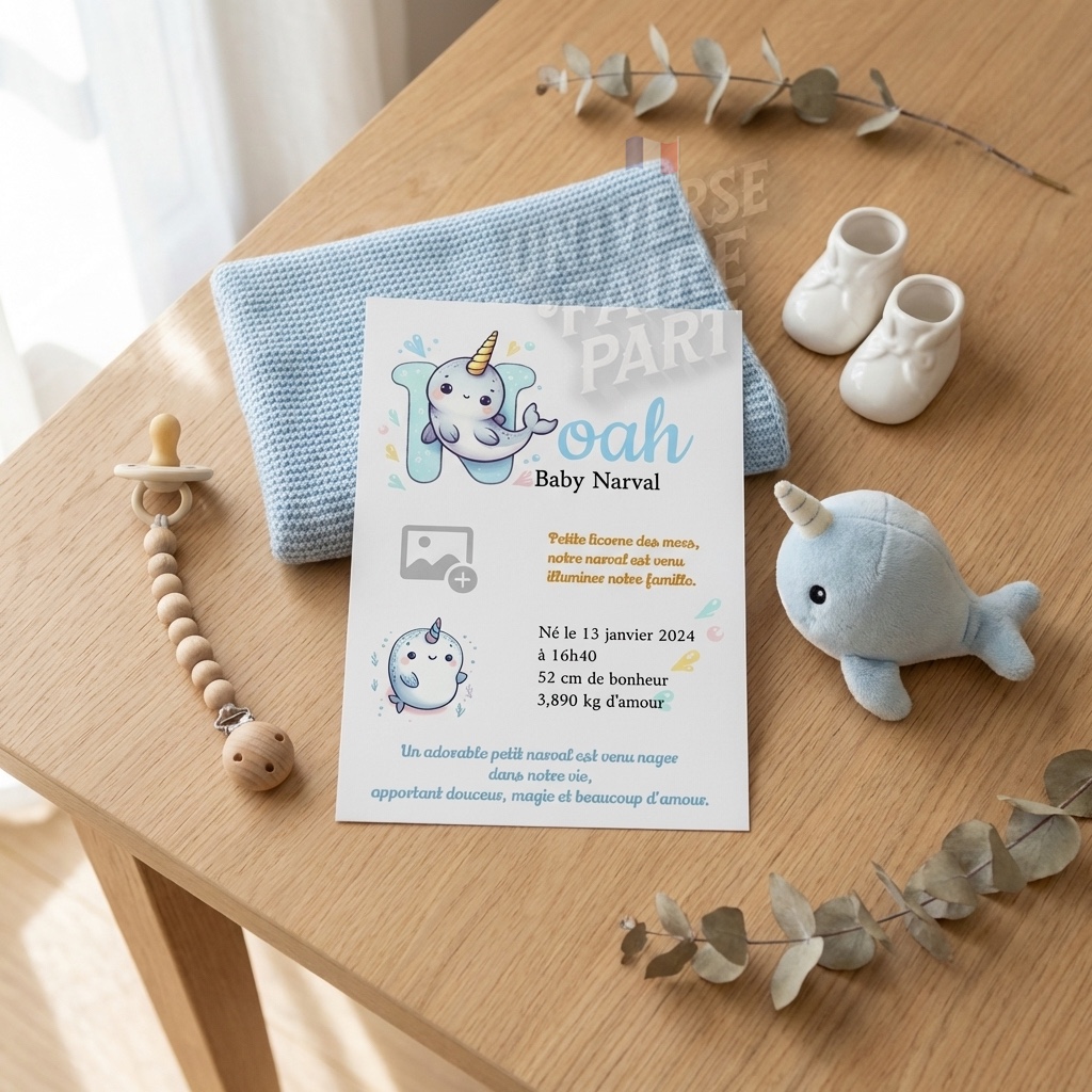Faire-Part ‘N’ pour Baby Narval – Idéal pour les Prénoms Commençant par N