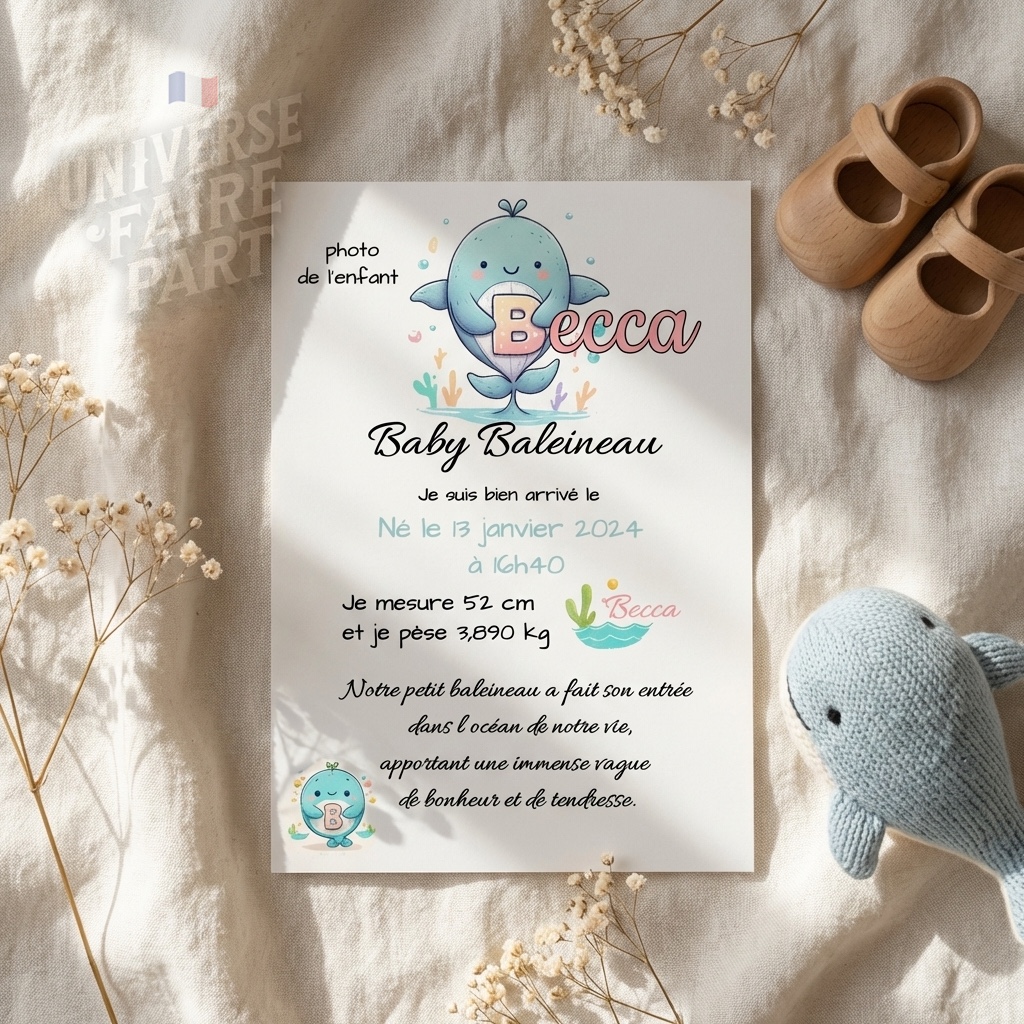- Sélectionnez le faire-part ‘B’ – Baby Baleine.