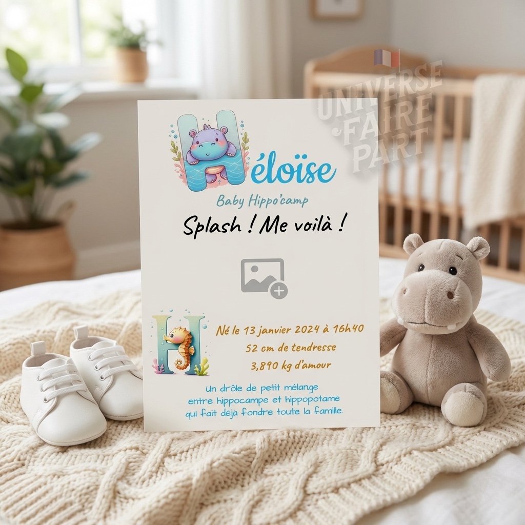 - Choisissez le faire-part ‘H’ pour Baby Hippocampe avec Maman.