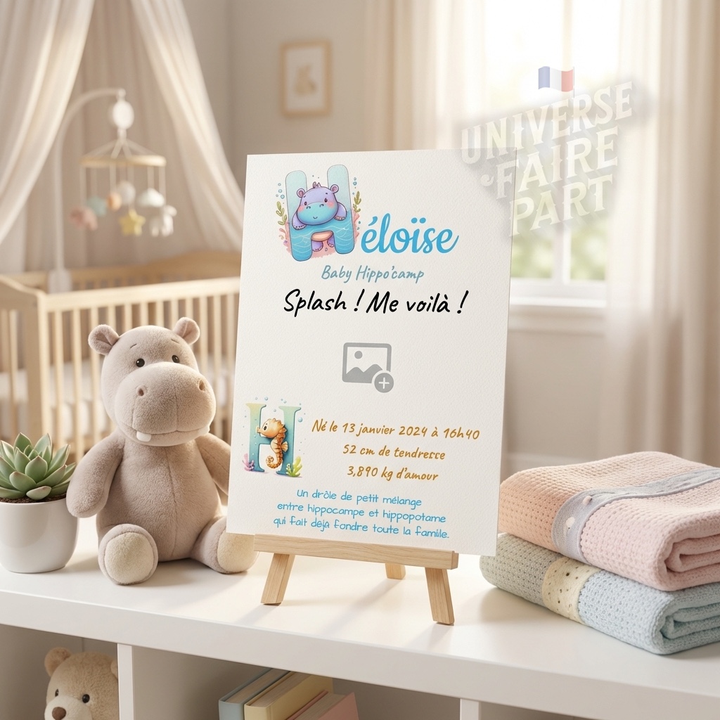 Ces prénoms sont également choisis pour leur popularité et leur diversité dans diverses cultures et régions. N°A8- faire-part naissance L’Alphabet des Animaux Hippopotame Hippocampe