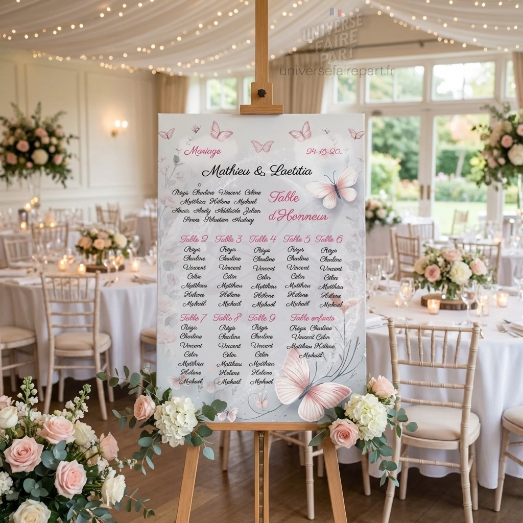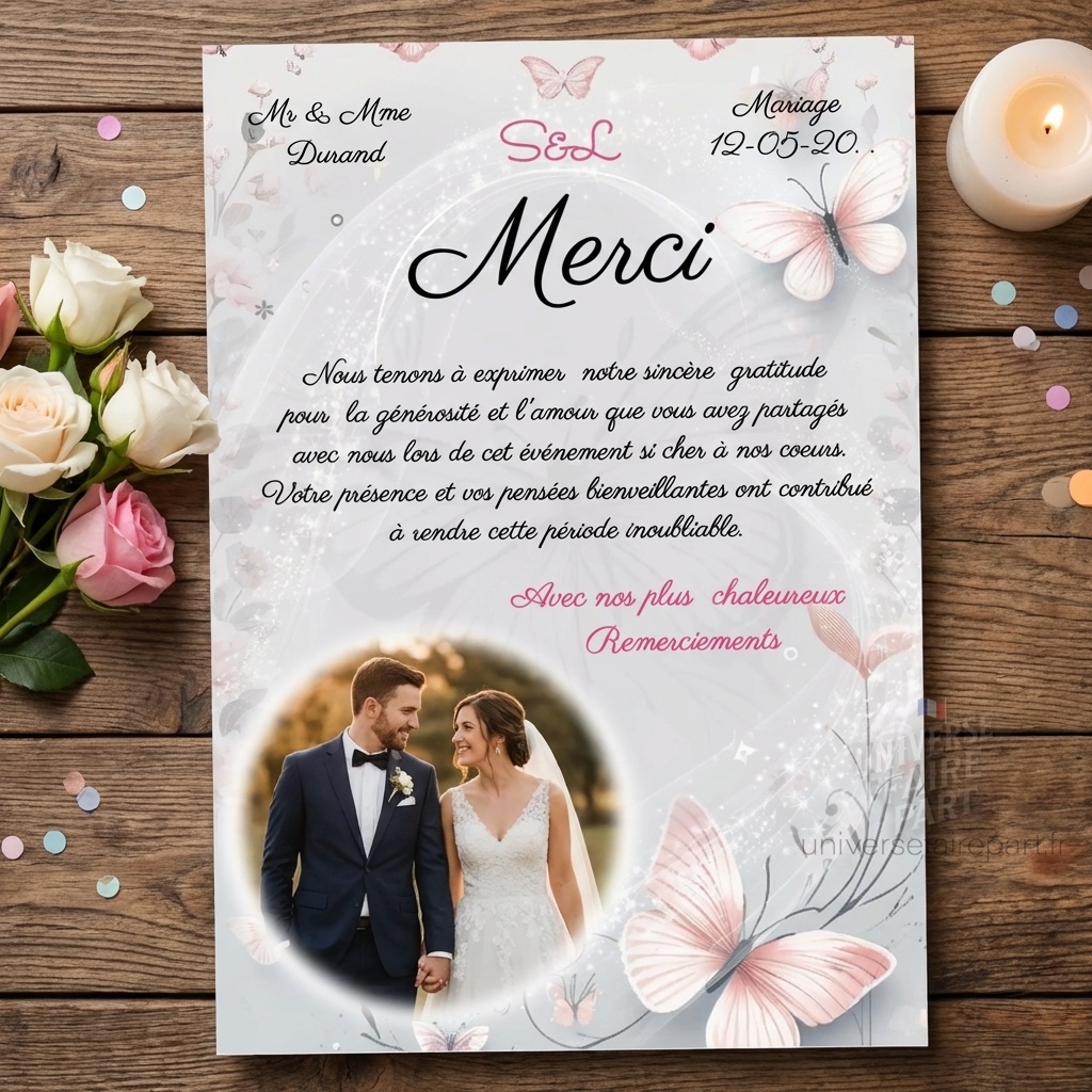 Chaque carte est une œuvre d’art, ornée de papillons délicatement dessinés, voltigeant parmi des fleurs subtiles sur un fond élégant. La palette de couleurs douces et le motif artistique créent une ambiance de rêve, idéale pour les annonces de mariage, les baptêmes, ou les célébrations de nouvelles naissances.