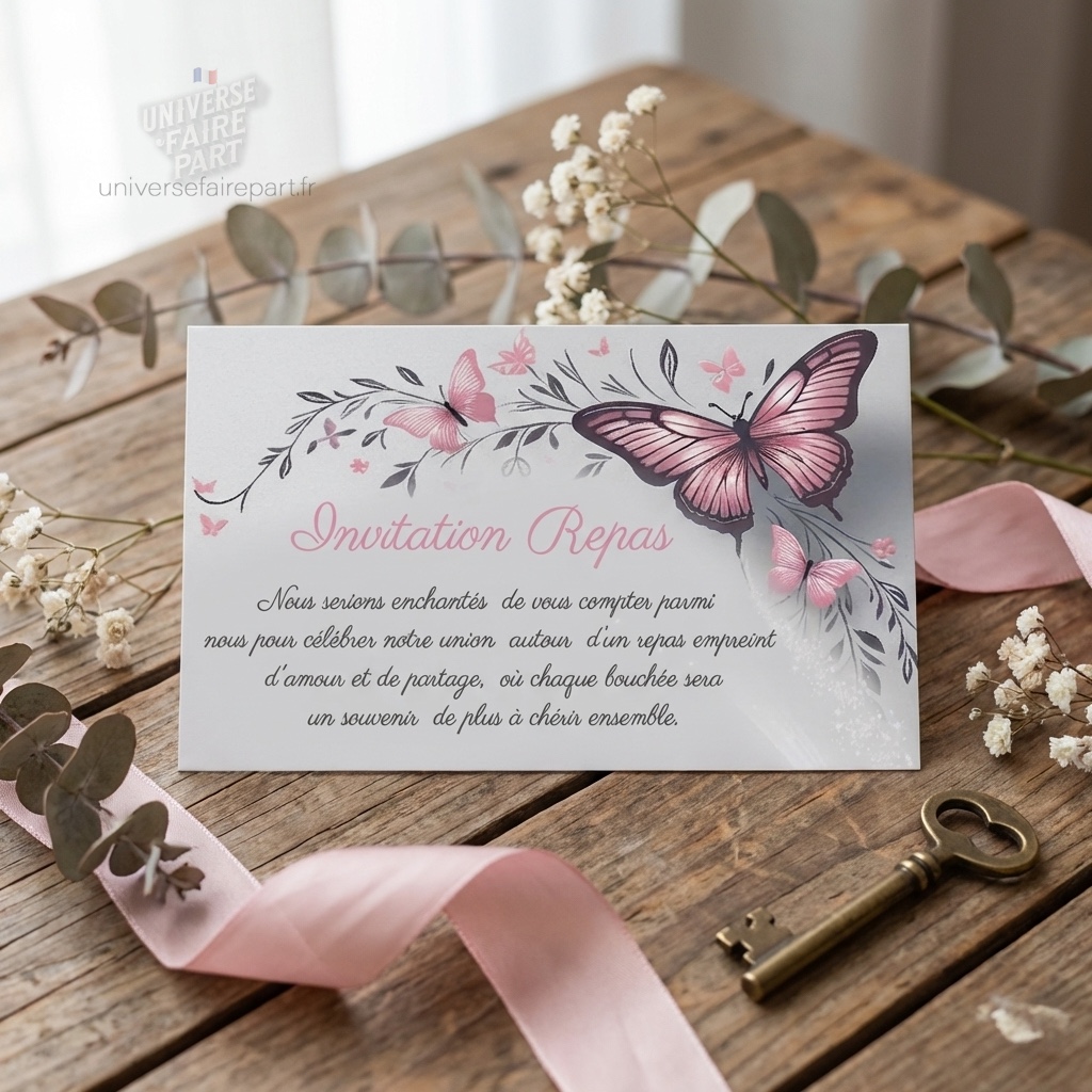 Personnalisable pour correspondre à votre message unique, ce faire-part est imprimé sur un papier de haute qualité, assurant que chaque détail est capturé avec clarté et finesse. Laissez « Vol de Bonheur Papillons Roses » être le messager de votre joyeuse nouvelle, invitant vos invités à un événement qu’ils n’oublieront jamais.
