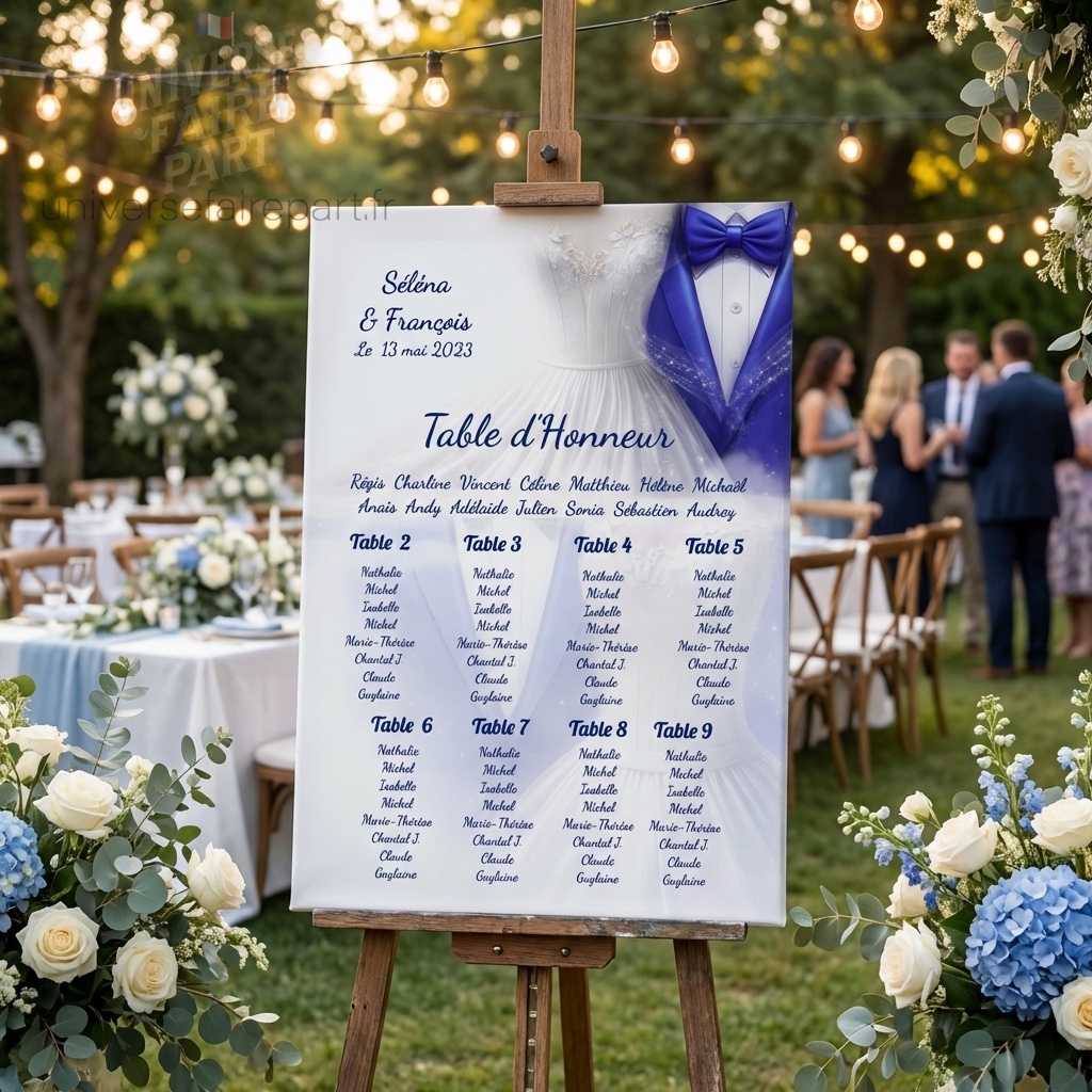 Guidez vos invités avec élégance et harmonie grâce à notre plan de table « Fusion des Cœurs » en bleu roi, parfaitement assorti à votre faire-part de mariage N°219. Ce plan de table ne se contente pas de diriger vos invités à leur place ; il sert également d’élément décoratif raffiné, enrichissant l’ambiance de votre réception avec son design élégant et sa symbolique affectueuse.