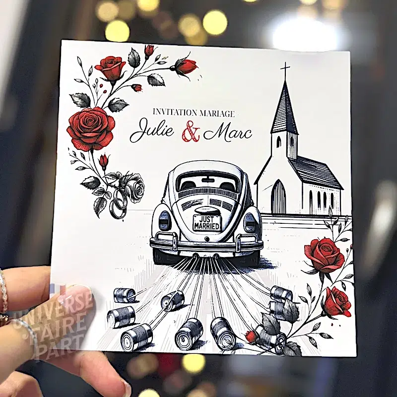 Organisez votre réception de mariage avec élégance et style grâce à notre plan de table « Un amour de coccinelle ». Ce plan de table, conçu dans un style croquis raffiné, présente une illustration détaillée de roses rouges, d’alliances et de la célèbre Volkswagen Coccinelle ornée de décorations de mariage.