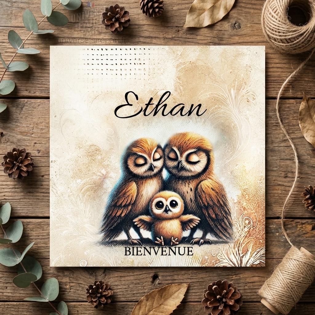 Description : Le rond collant « Bienvenue notre petite Chouette » est orné d’une illustration artistique représentant une famille de chouettes, entourée d’un fond marron et blanc travaillé au fusain. Ce sticker élégant et intemporel est conçu pour apporter une touche finale parfaite à vos faire-part et cartes de félicitations, tout en renforçant le thème de la chouette et de la naissance.