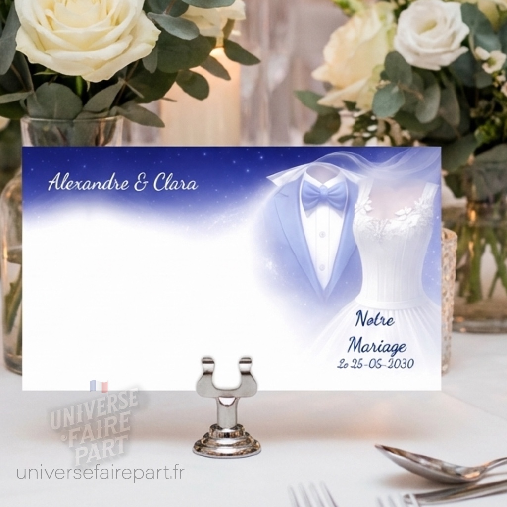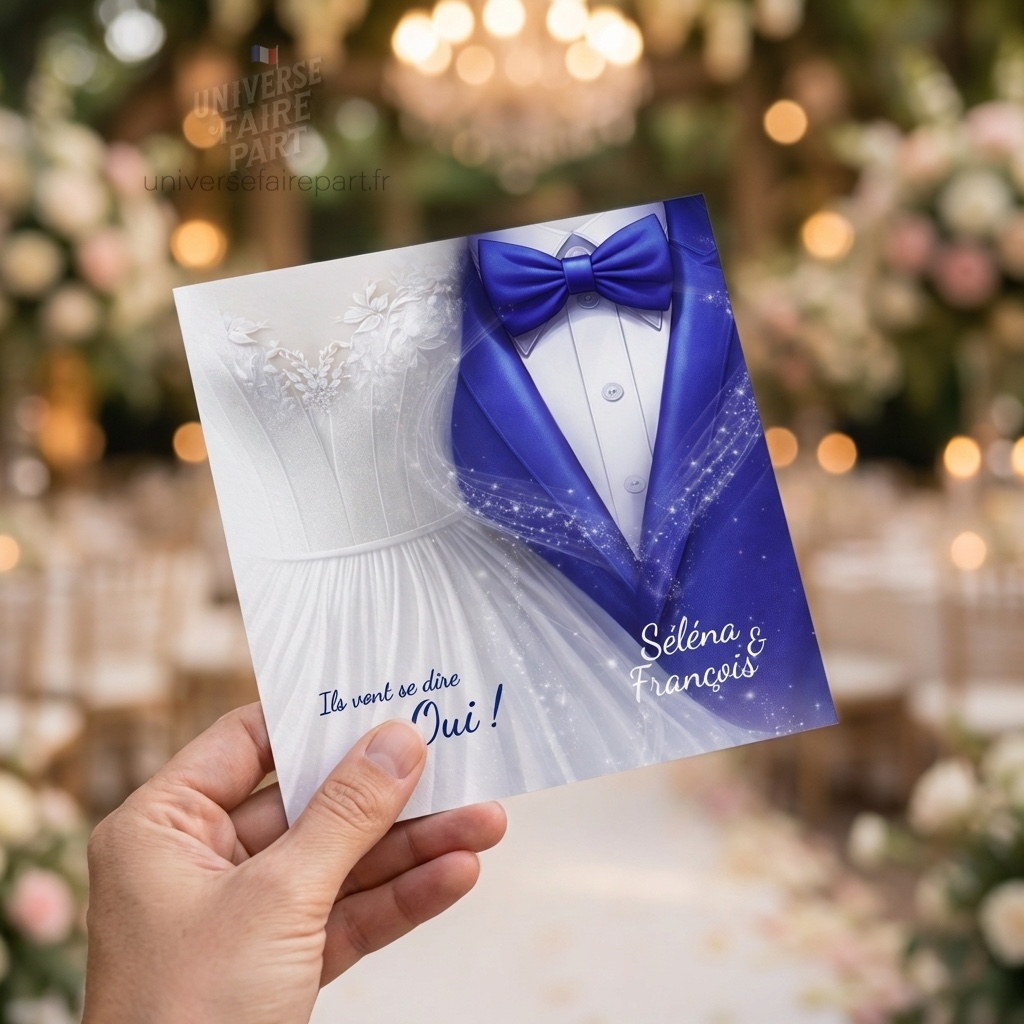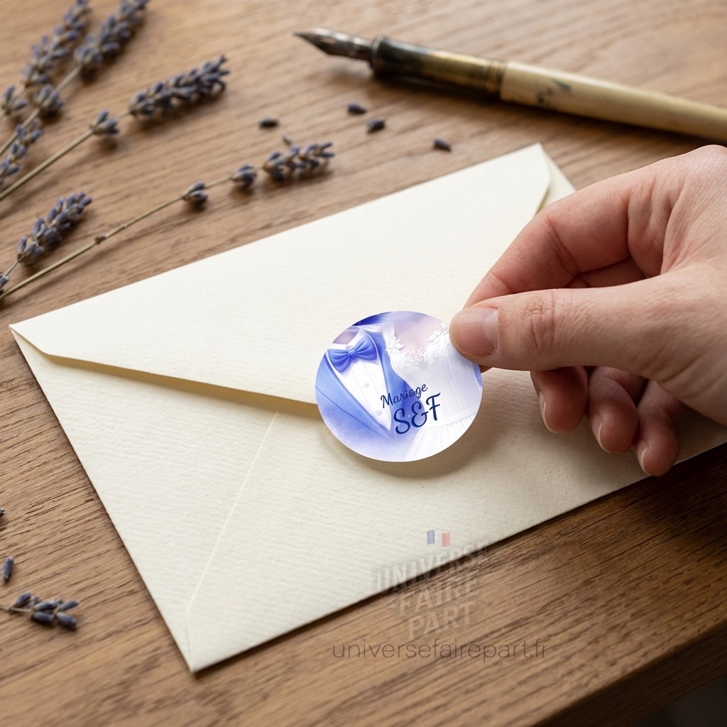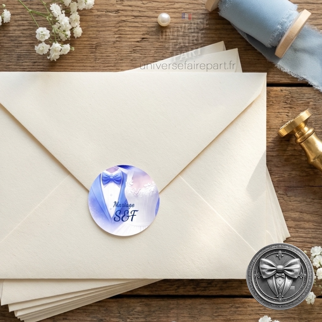 Personnalisez chaque détail de votre célébration avec notre rond collant « Fusion des Cœurs » en bleu roi. Cet accessoire délicat est conçu pour s’accorder avec la grâce et l’élégance de votre faire-part de mariage N°219, en apportant une note de raffinement à tous les éléments de votre grand jour.